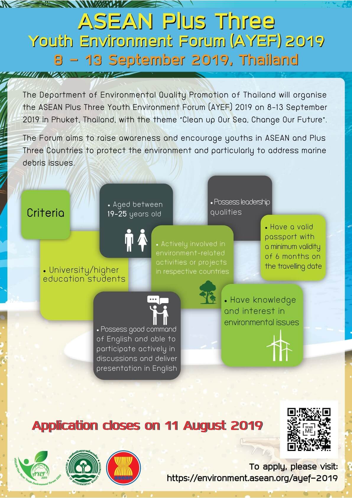 AYEF 2019 will be organised by the Department of Environmental Quality Promotion of Thailand in cooperation with the ASEAN Secretariat, in Phuket, Thailand, from 8-13 September 2019. With the theme “Clean up Our Sea, Change Our Future”, the Forum aims to: